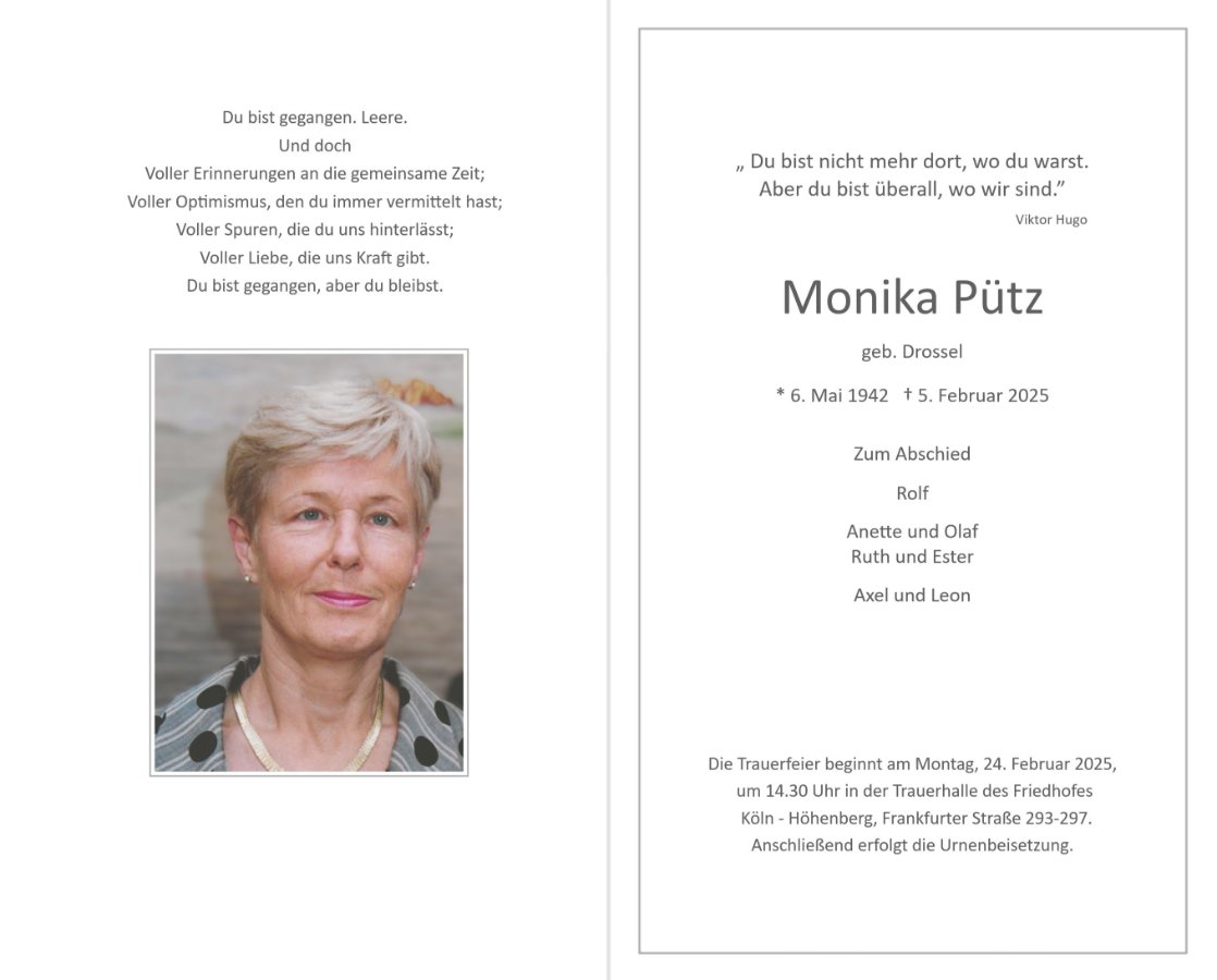 wir wünschen Ihnen für die kommende Zeit viel Kraft und dass es Ihnen gelingt, dankbar auf die positiven Erinnerungen zurückzublicken. Diese Gedenkseite möge Ihnen dabei helfen, Ihre Trauer zu teilen und das Andenken gemeinsam wachzuhalten.