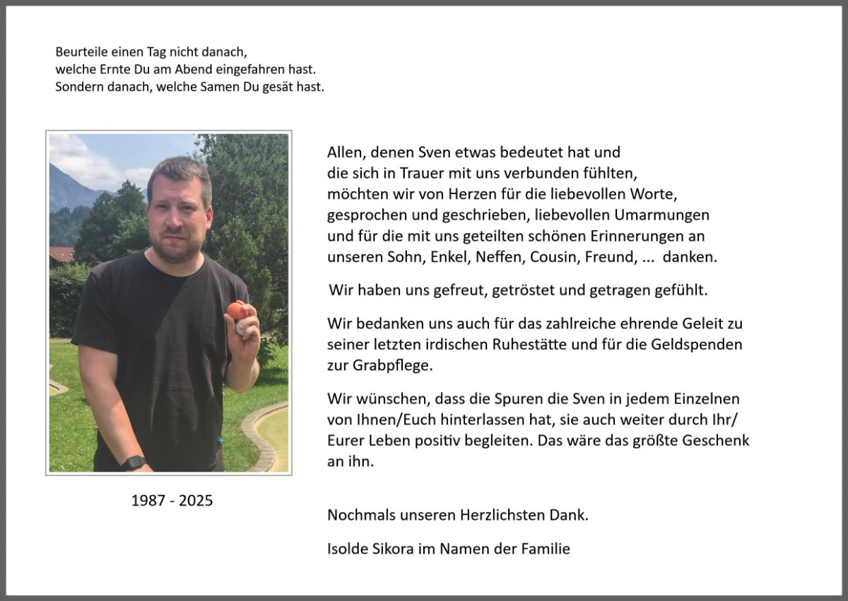 mit großer Bestürzung und tiefer Trauer haben wir vom plötzlichen Tod Ihres Sohnes,Enkels erfahren. Es ist schwer in Worte zu fassen, was sein Weggang für uns bedeutet.